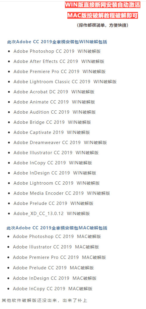 Adobe 2019全家桶Win+MAC已破解,两个版本都有PS-AI-AE-AN-ID-LR-PR-XD-DW