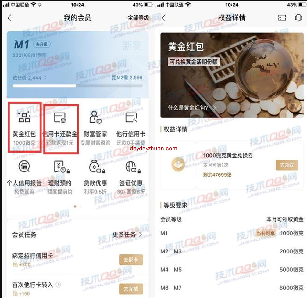 招商银行APP会员等级不同领取1000-10000微克黄金,小编是M1只领取到了1000微克,卖出后可以获得0.48元,还有1元还款金,还10元返1元现金,这个活动每个月都能参与。
