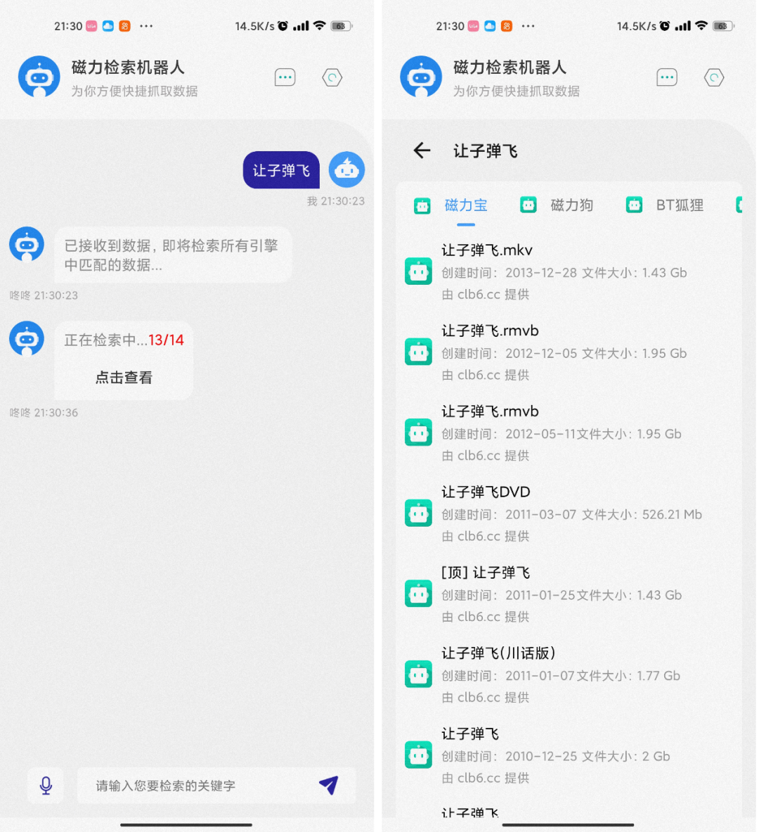 “磁力检索机器人”,它是一款简洁的资源搜索软件,采用聊天式的搜索方式,给用户全新的搜索体验;这款软件是一款简洁的磁力检索机器人,资源检索的方法是聊天形式呈现,给你全新的搜索体验;软件的搜索源也不少,磁力资源非常丰富,几乎所有的资源都能轻松找到,资源清晰度、大小等也都会有标注;资源按热度排序,可以优先下载优质资源,操作简单。