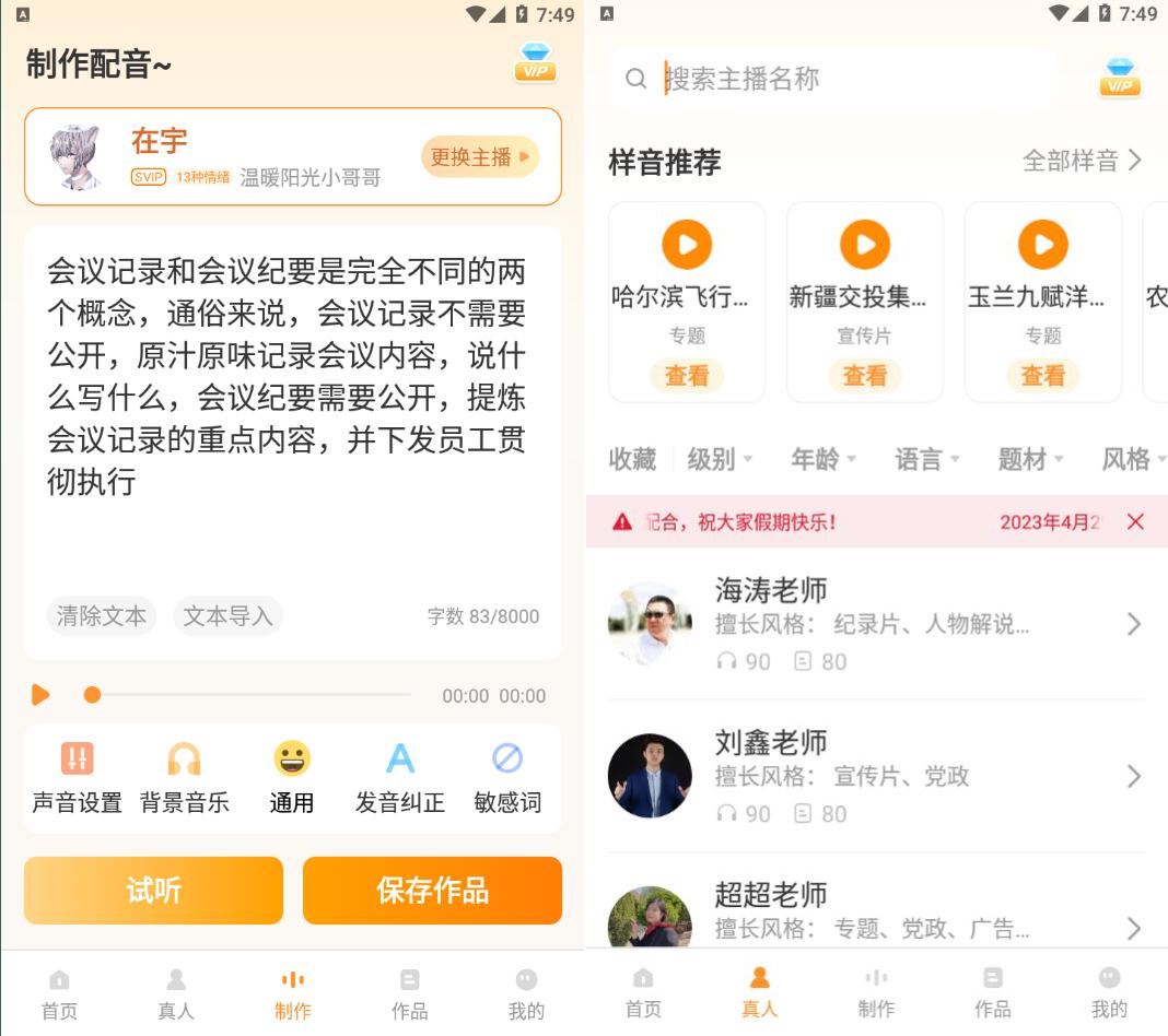 配音鸭文字转语音拥有强大的语音技术,海量配音模板,多语种模式切换(中/日/韩/美/方言等),以及上百种合成主播及真人主播声音供您挑选,加上多风格背景音乐,最终制作出优质完美的配音效果,为您定制专属的私人优质配音服务。 配音鸭文字转语音可用于超市播报、促销配音、宣传片配音、外语配音、铃声制作、地摊叫卖、有声朗读、影视解说,动画配音等多场景使用。 鸭鸭这里私藏了好多文案范例、背景音乐和各类主播的音源,如果恰好你是一个懒癌患者+选择困难症患者,那么鸭鸭还有海量的合成示例与真人示例成品供你选用。 鸭鸭还是一个时尚潮流的弄潮儿呢!抖音、快手等自媒体视频平台上的流行声音鸭鸭都有收录进来的,比如杠精哥,各地方言等,因为鸭鸭想要带领你们一起走向潮流前沿。 会员解锁软件截图