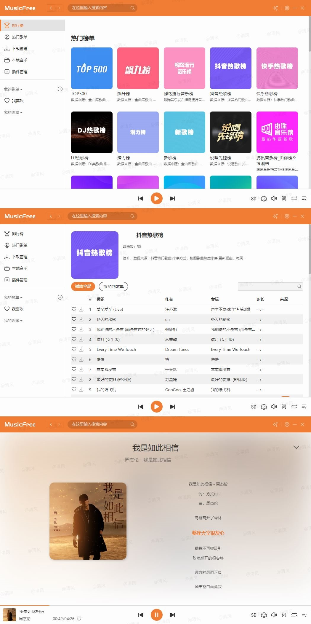 【应用简介】MusicFree 仅仅是一个播放器,本身并不集成任何平台的任何音源,所有的搜索、播放、歌单导入等功能全部基于插件。这也就意味着,只要可以在互联网上搜索到的音源,只要有对应的插件,你都可以使用本软件进行搜索、播放等功能。插件现已打包好,导入即可畅听全网音乐。