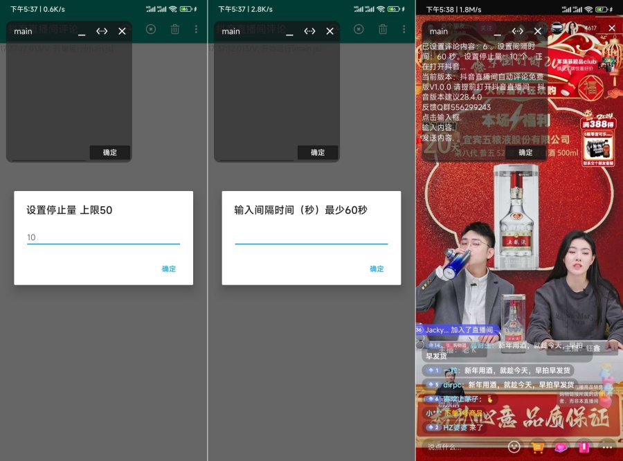 自定义评论内容,可设置间隔几秒评论一次,可设置固定评论几个就停止运行。测试使用28.4.0版本的抖音,其他版本自测!软件截图