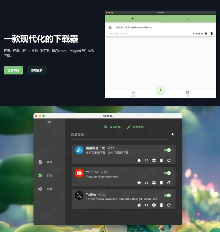 Gopeed是一款在Github上开源的轻量级高速下载工具,基于Golang + Flutter开发,它界面美观,支持(HTTP、BitTorrent、Magnet 等)协议下载,支持多线程高速下载,多平台支持,简单好用。首先,Gopeed界面简洁美观,支持明暗两种主题,与我们之前介绍过的Motrix软件一样,简单的左右布局。使用方法也很简单,只需点击右下角新建任务,添加HTTP、BitTorrent、Magnet链接就行,下载速度对标IDM,最高连接数能达到256,理论上一些迅雷不能下载的文件也可以下载,不受版权、xx等限制。Gopeed拥有扩展系统,你可以安装或者根据开发文档开发各种插件,目前官方开发了三个拓展,分别是百度网盘、YTB还有tw下载,只需要复制下面这三个链接到拓展页面安装即可。