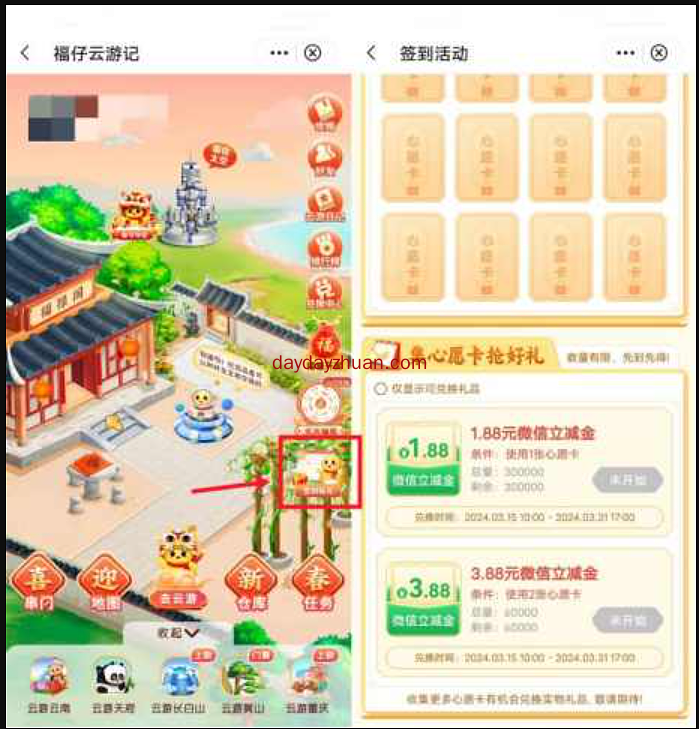 中国银行的【福仔云游记】里,昨天开始上线了签到赢好礼的活动,通过打开中国银行APP进去签到有礼活动里,每连续签到7天可以得到1张心愿卡,完成指定的任务也可以得到心愿卡,得到心愿卡后可以在3月15日10:00起兑换微信立减金,天天线报网的赚友赶紧上吧. 1、先在各大应用市场搜索【中国银行】下载APP; 2、打开中国银行APP后,搜索【福仔云游记】进去活动页面; 3、然后自右侧图标【签到有礼】进去,每连续签到7天可以领到1张心愿卡,然后在3月15日10:00可以用心愿卡兑换1.88元、3.88元微信立减金,数量限量