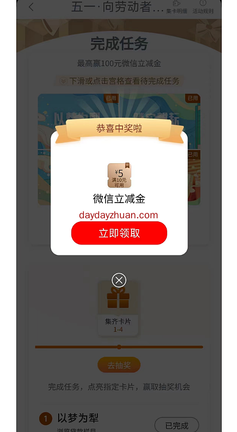 打开【工商银行】APP搜索“任务中心”进入,享活动--“五一向劳动者致敬”进去,完成4个简单的浏览任务抽卡,集齐合成后可以抽奖1次,亲中5元立减金,非必中