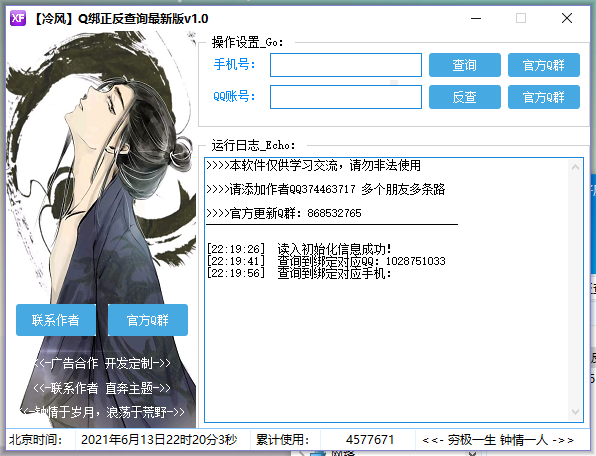 冷风Q绑正反查询是一款可以用来查自己或者查别人QQ所绑定的手机号以及手机号所绑定的QQ,很多用户可能是很早之前的手机号绑定的QQ,现在都忘记手机号码了,或者是想知道别人的QQ绑定的手机号是多少,那么都能够使用此款工具来查询,不一定全部都能够查到,但是能够查到的都是很准确的。