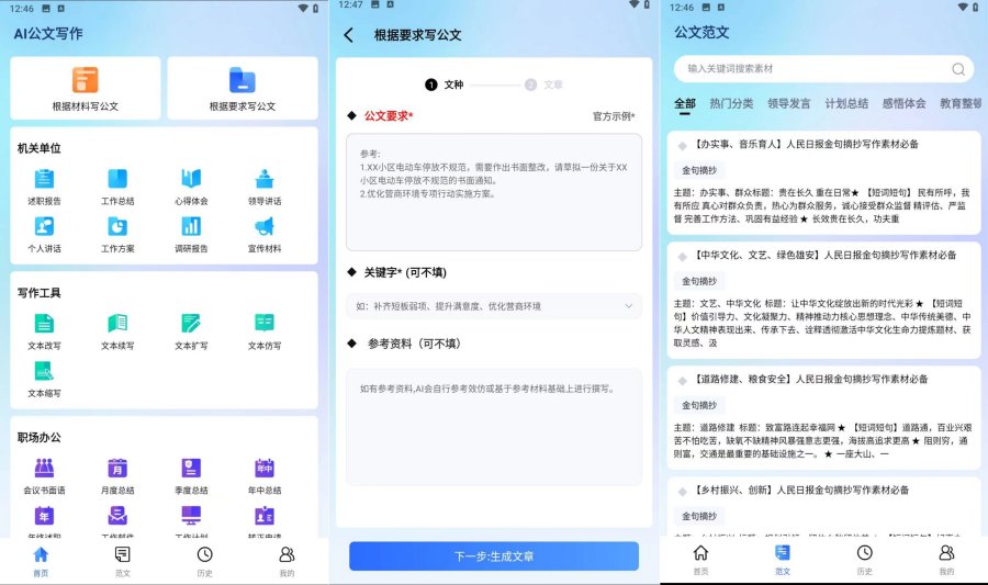 1、软件提供了各种场景的范文资料,搜一下相关范文,填入要求内容,就能生成心仪的文章。