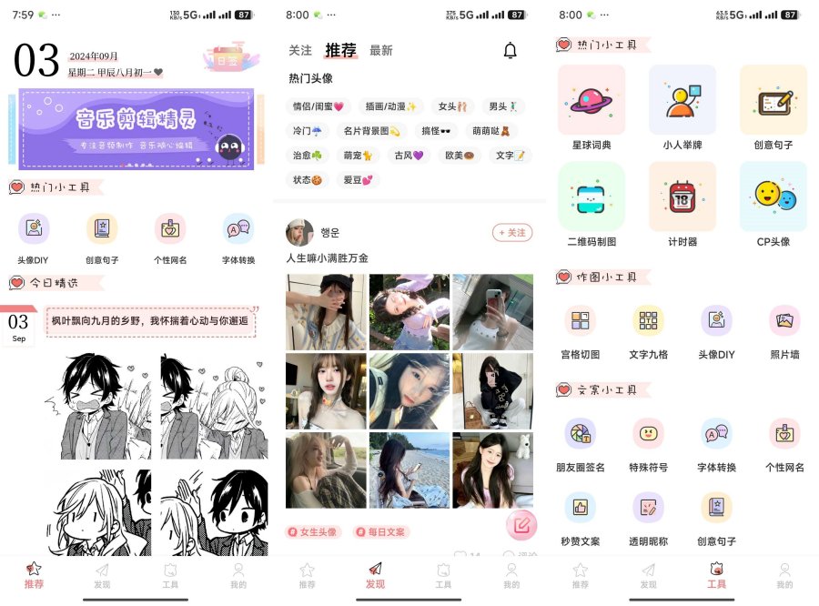 【应用名称】:头像空间 【应用包名】:com.orangemedia.avatar 【应用版本】:7.0.1 【应用大小】:67.0MB 【官方介绍】:头像空间,不止好看的头像。 ⭐个性头像 ⭐DIY头像制作 ⭐网名签名文案 ⭐动漫头像 ⭐超多热门神奇小工具助你提升人气 【定制专属头像】给你的头像加上好看又特别的头像边框、趣味贴纸或文字。 【个性头像大全】涵盖分享的女生头像、男生头像、闺蜜头像、情侣头像、动漫卡通头像、爱豆明星可爱古风搞怪逗比霸气伤感热门冷门头像任你挑选!还有名片背景图、高清美图等你来拿。总能找到适合你的qq微信社交头像~ 【交友扩列】在广场浏览或分享美图文案、今日心情、学习打卡、日常生活。还能收获超多点赞和粉丝哦~ 【神奇小工具】 文案小工具:透明昵称、秒赞文案、字体转换、特殊符号、朋友圈签名,不随大众更有个性 作图小工具:照片墙、文字九格、宫格切图 小人举牌:换个方式表白、斗图更有气势~ 个性二维码:将想说的话,替换成与众不同的二维码传递,不按套路出牌 星球词典:热门黑话玩梗冷知识合集,奇奇怪怪的知识又增加了~ 桌面计时器:可爱小巧的计时器,时刻提醒自己某个重要的时刻 还有更多趣味小工具,等你发现!