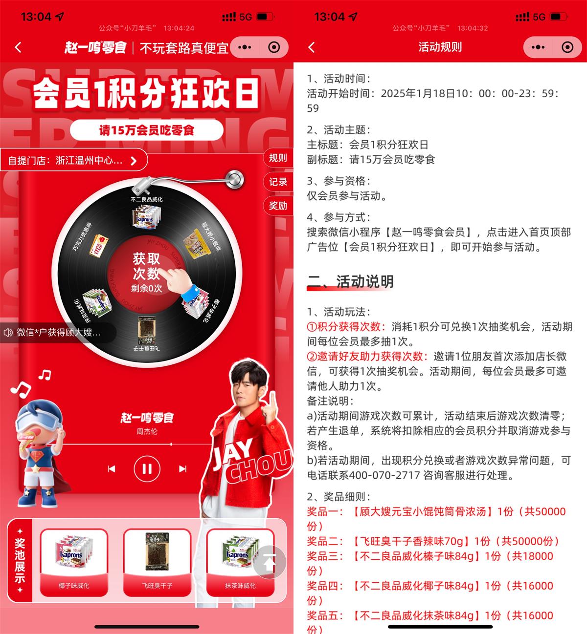 微信进入#小程序:赵一鸣零食 ->首页横幅进入->使用1积分抽零食,需到店核销使用